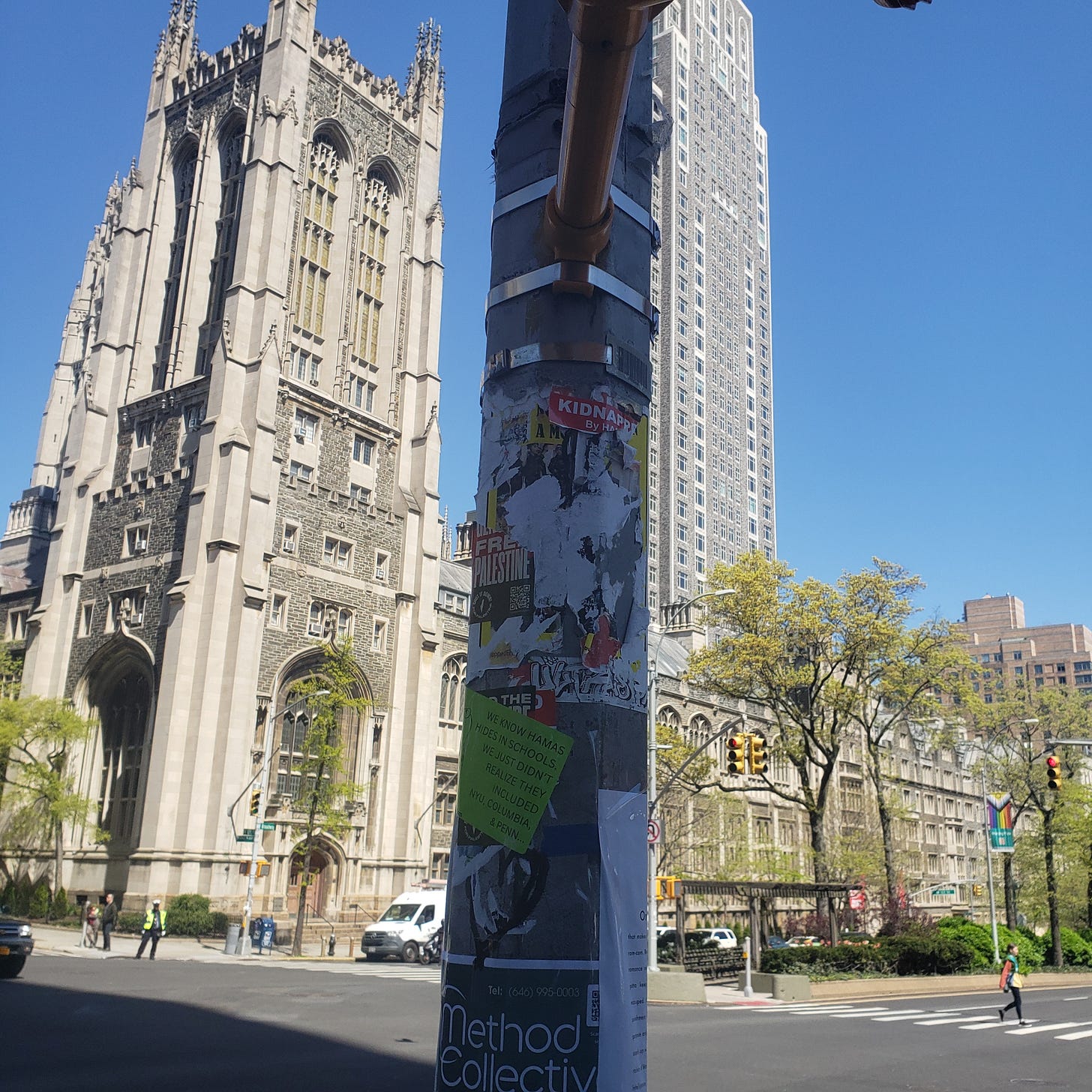 The main sign of conflict was not the people, but the posters. All across the block, I could see what amounted to a shadow war of the public poles. Many of these poles have posters from both pro- and anti-Israel people. The pro-Israel ones show the faces of the hostages or condemn Hamas. The anti-Israel posters say "Free Palestine" or call to shut down the campus. A few were about joining the Communist Party. Almost all of these posters, on both sides, were ripped and torn on every pole. I saw some girls walking down the street and putting up new pro-Israel posters showing the hostages. Someone will likely come out to rip it off later and tape a Free Palestine message over it.